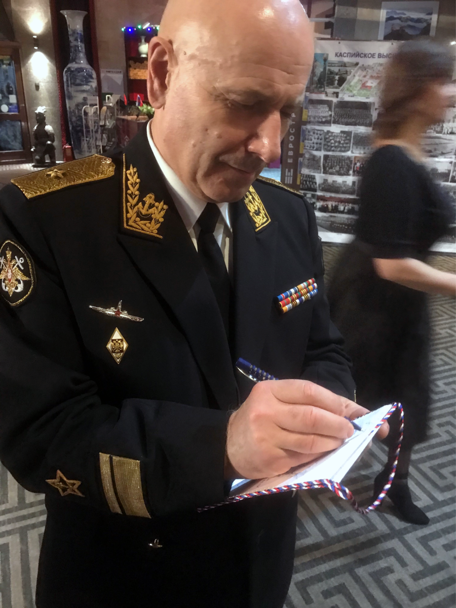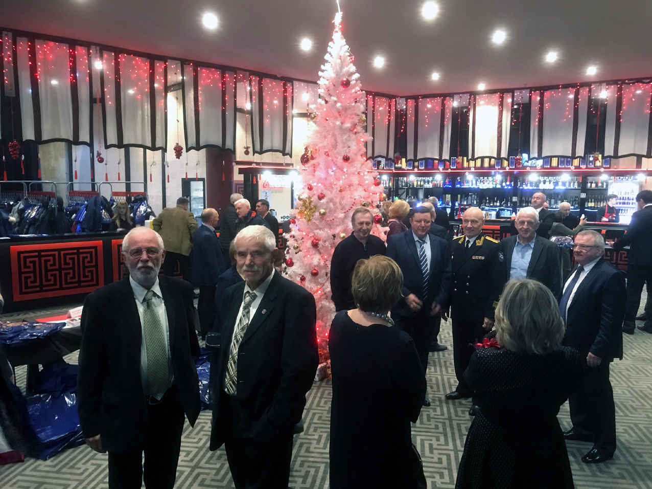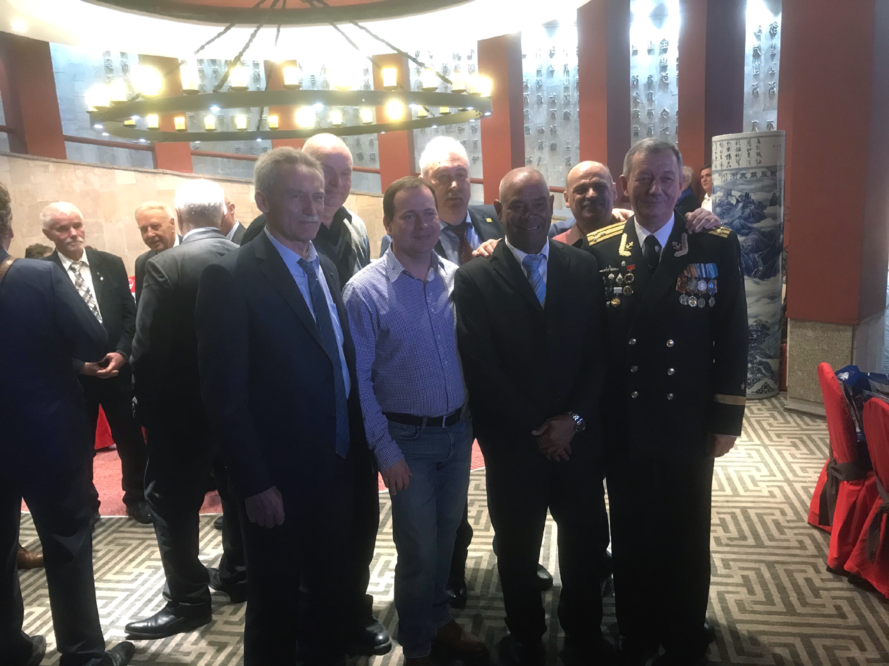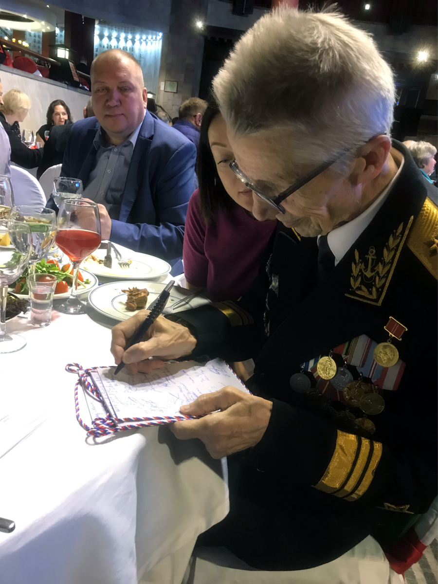 Bei der Registrierung erfuhren wir, dass ungefähr 500 Teilnehmer sich angemeldet hatten. Für uns ausländische Absolventen war ein großer runder Tisch mit der N°34 festlich eingedeckt. Dort nahmen zwanzig deutsche, ein kubanischer, ein libyscher und ein ungarischer Absolvent der Schule Platz. Ich wusste gar nicht, dass auch ungarische Offiziersschüler je an der Offiziersschule studiert hatten. Man lernt sogar fast fünfzig Jahre danach nicht aus. Die gesamte Ausstellungshalle wirkte festlich, war weihnachtlich durch die chinesischen Betreiber des Restaurants in karminrötlichem Ton ausgestaltet. Die Tische waren festlich geschmückt, Geschirr, Gläser und Essbesteck waren Hochglanz poliert. Eine angenehme Atmosphäre beim Betreten des Festsaals. Ich lernte Fregattenkapitän Wassili Solowji, den Hauptorganisator dieser großen Festveranstaltung persönlich kennen, mit dem ich schon vorab in Kontakt stand. Holger Neidel, der uns am Platz begrüßte, teilte uns mit, dass er soeben dem Fernsehen von Sankt Petersburg ein Kurzinterview gegeben hat.