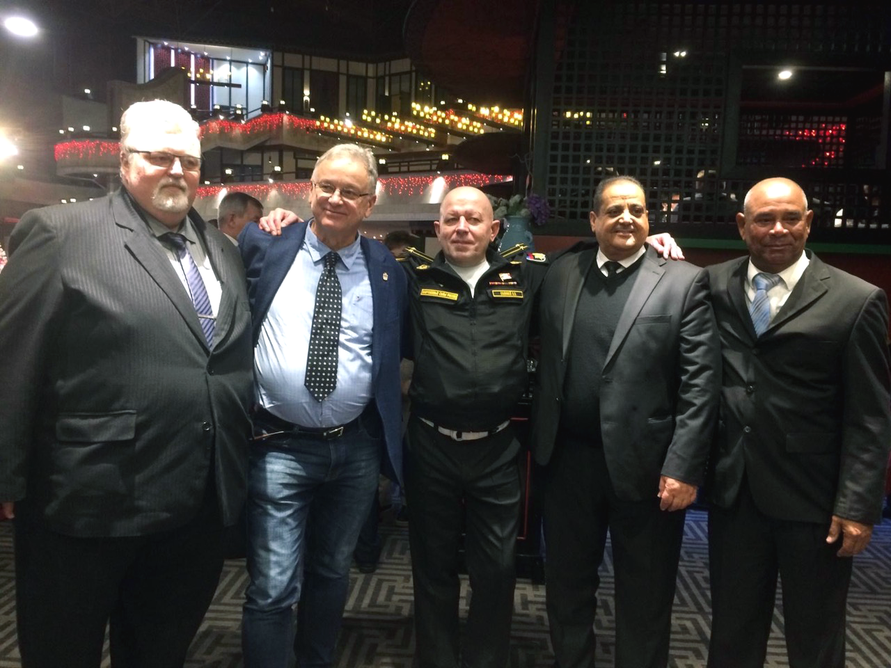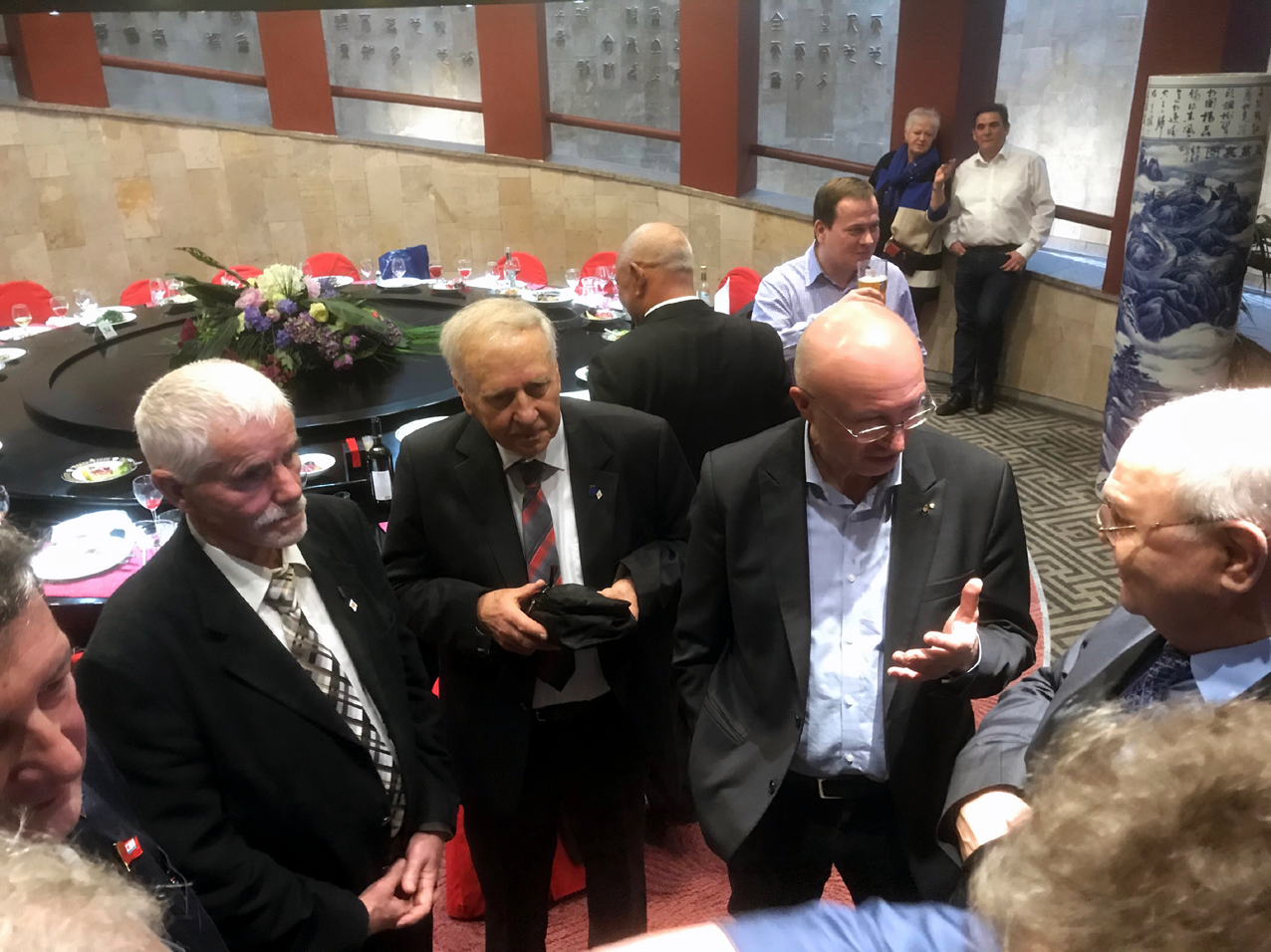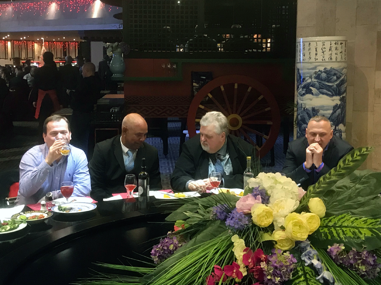 Bei der Registrierung erfuhren wir, dass ungefähr 500 Teilnehmer sich angemeldet hatten. Für uns ausländische Absolventen war ein großer runder Tisch mit der N°34 festlich eingedeckt. Dort nahmen zwanzig deutsche, ein kubanischer, ein libyscher und ein ungarischer Absolvent der Schule Platz. Ich wusste gar nicht, dass auch ungarische Offiziersschüler je an der Offiziersschule studiert hatten. Man lernt sogar fast fünfzig Jahre danach nicht aus. Die gesamte Ausstellungshalle wirkte festlich, war weihnachtlich durch die chinesischen Betreiber des Restaurants in karminrötlichem Ton ausgestaltet. Die Tische waren festlich geschmückt, Geschirr, Gläser und Essbesteck waren Hochglanz poliert. Eine angenehme Atmosphäre beim Betreten des Festsaals. Ich lernte Fregattenkapitän Wassili Solowji, den Hauptorganisator dieser großen Festveranstaltung persönlich kennen, mit dem ich schon vorab in Kontakt stand. Holger Neidel, der uns am Platz begrüßte, teilte uns mit, dass er soeben dem Fernsehen von Sankt Petersburg ein Kurzinterview gegeben hat.
